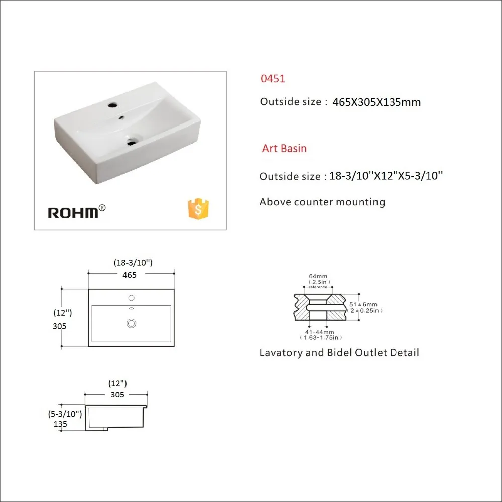 0451 Rectangular Common Design with Faucet Hole Bathroom Ceramic Basin